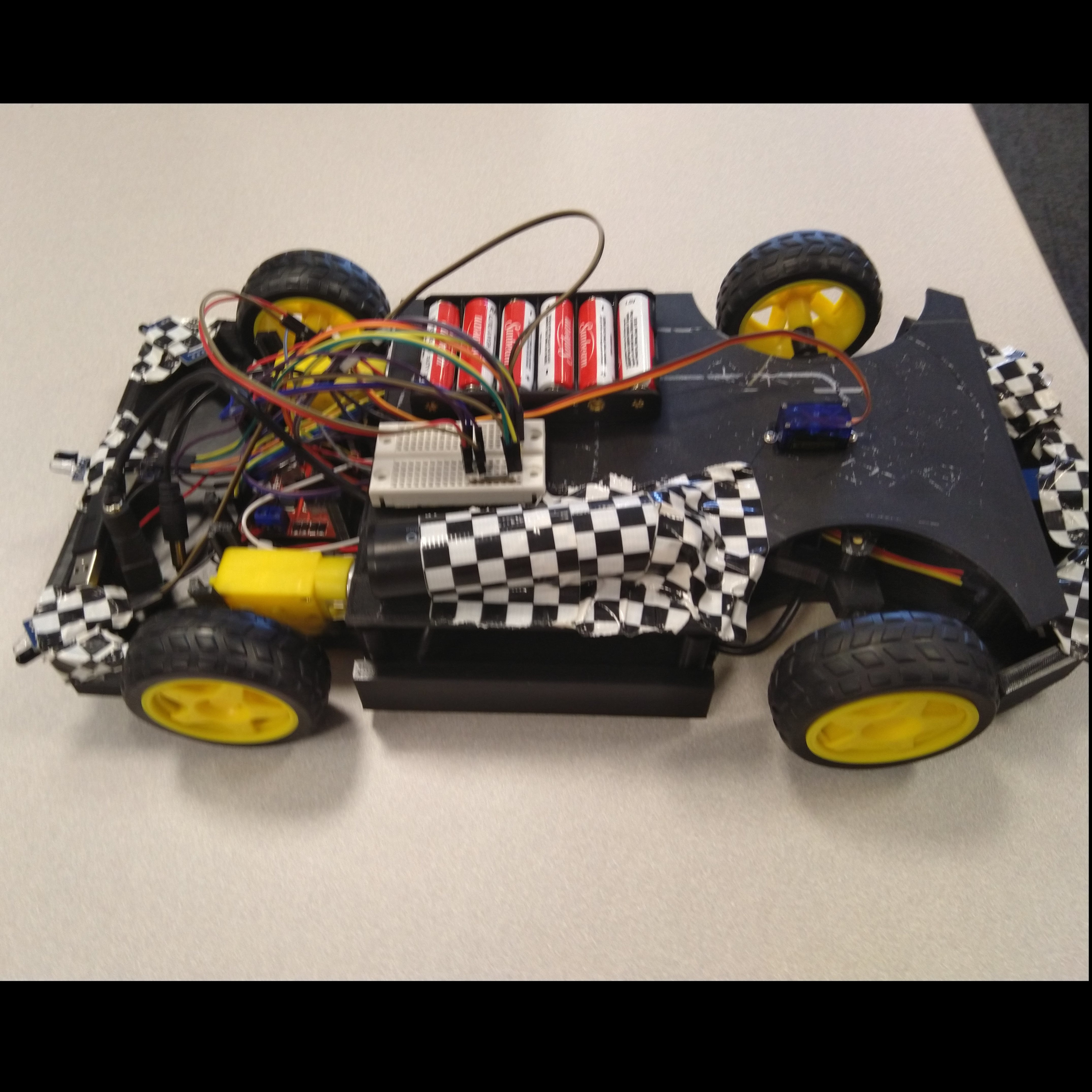 A four-wheeled robot that uses IR sensors to detect objects and steer away from them.